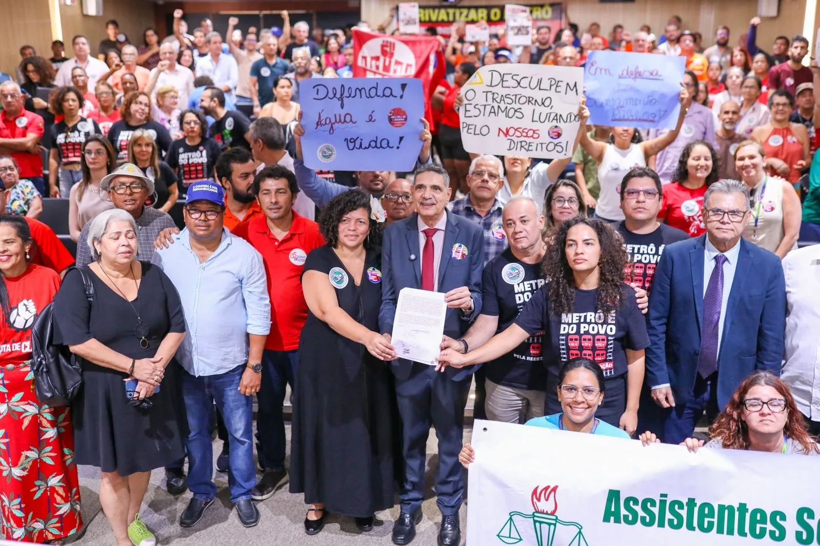 O presidente do Sindicato dos Metroviário de Pernambuco, Luiz Soares, cobrou do presidente Lula (PT) o cumprimento da promessa dele à categoria durante a campanha eleitoral de 2022. “Eu entreguei nas mãos dele o documento e ele se comprometeu a não privatizar empresas estratégicas. Então por que ele está privatizando a CBTU?”, questiona. “Não pode conceder à governadora Raquel Lyra, que não tem compromisso nenhum – se tivesse, não estaria privatizando a Compesa”, reclamou Soares. O professor e comunicador Jones Manoel também participou do evento.