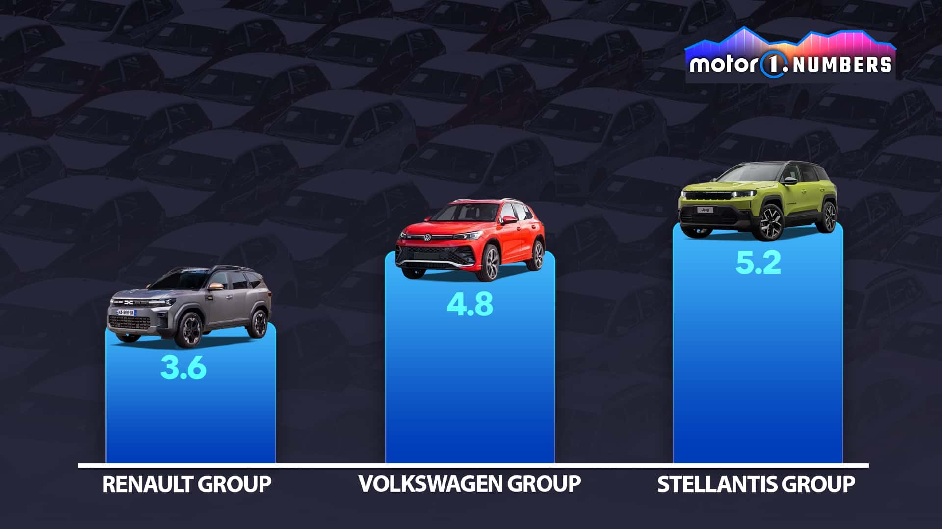 O pior desempenho entre os três grandes grupos europeus é da Stellantis, com uma idade média de 5,2 anos em sua linha de 58 modelos. Mesmo com marcas de forte presença como Peugeot, Fiat, Citroën e Jeep, o grupo sofre com modelos antigos que ainda seguem em linha, como o Fiat Panda (lançado em 2011), Jeep Renegade (2014) e os comerciais grandes Peugeot Boxer, Citroën Jumper e Fiat Ducato. Mesmo com a chegada recente à Europa de novos Compass e C5 Aircross, a média ainda reflete um portfólio que envelheceu sem substitutos diretos.